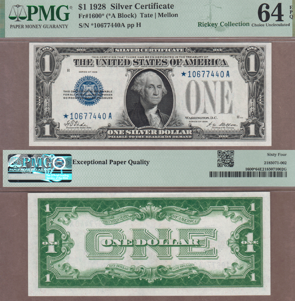 Item Number: SSC-315 PMG Choice Uncirculated 64 EPQ - FR-1600* Tate/Mellon - Beautiful fresh clean STAR note with Exceptional Paper Quality "EPQ". First series for the Funny Back silver certificate. $535.00