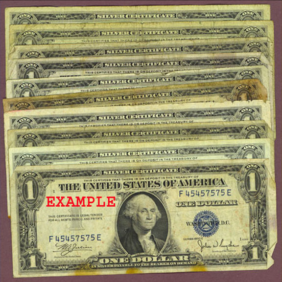 Item Number: SCerts-10 10 Average Circulated $1.00 Silver Certificates w/ BLUE Seal - There will be both 1935 & 1957 series notes. They will be well circulated but complete without any missing corners. Limited supply at this price.$30.00