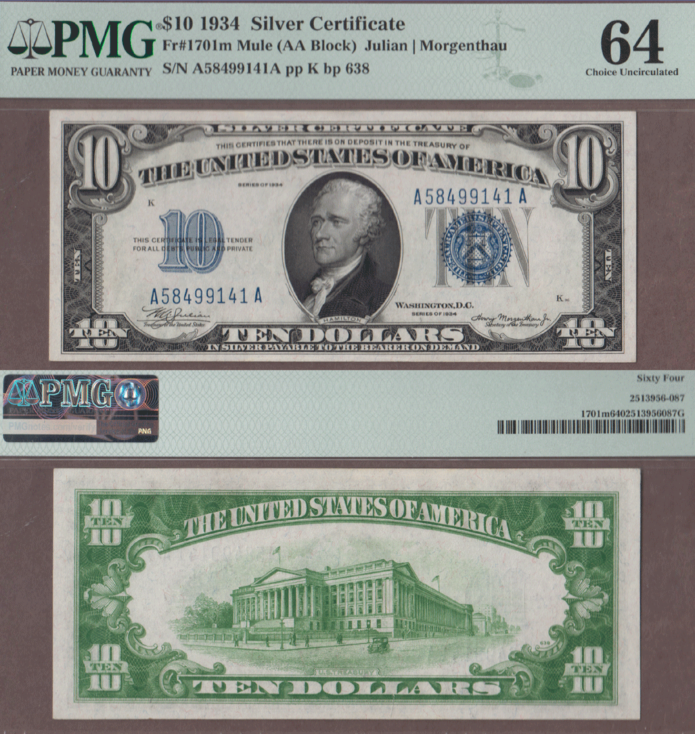 Item Number: SSC-301 PMG Choice Uncirculated 64 - FR-1701m "Mule" Julian/Morgenthau - Pack fresh near GEM with excellent margins and clean white paper. The serial # is consecutive with the GEM 65 on the web site. $230.00