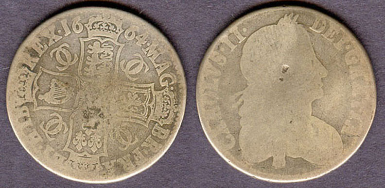 Item Number: GB-45 Good - Silver 1/2 Crown Head of King Charles II facing right. King Charles ruled England 1660-1685. Larger than a US Half Dollar. Almost 350 years old!$85.00