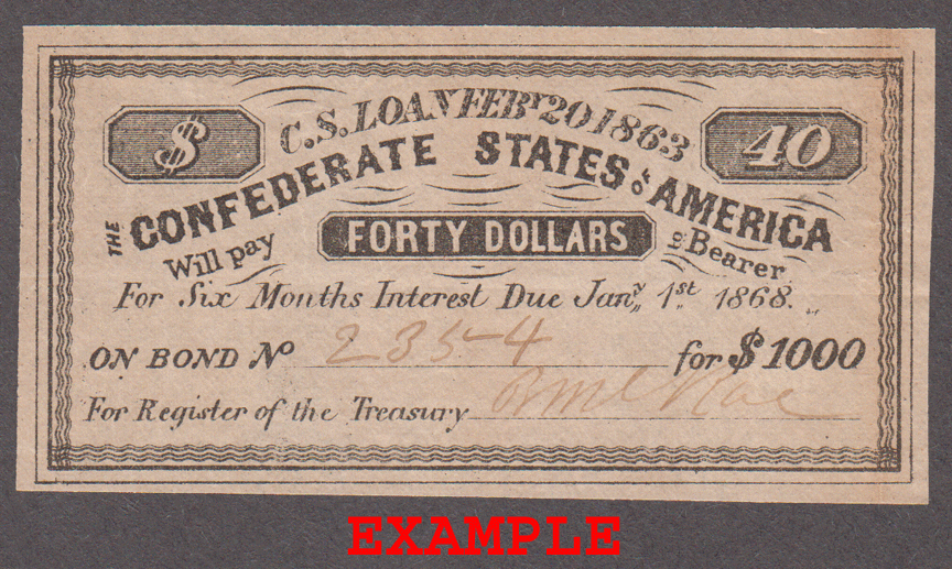 Item Number: CSA-206E Fine or Better - You will receive a $40 Confederate bond interest coupon from a 1863 $1000 Confederate Bond. Printed area approximately 1-3/4" X 3-1/2" $5.00