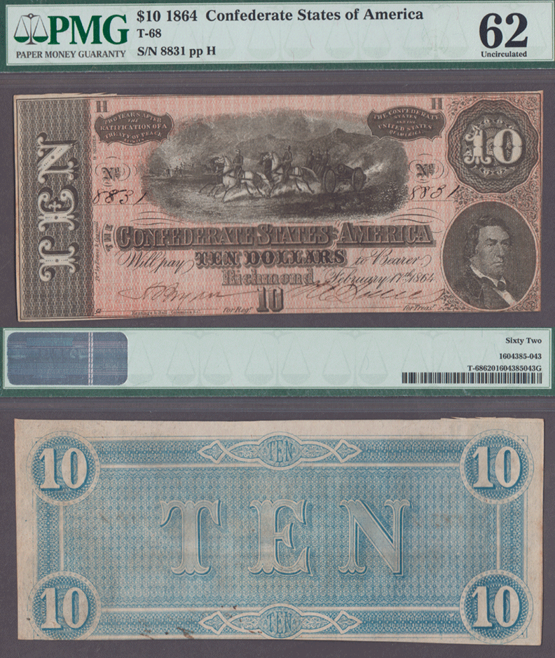 Item Number: CSA-212 PMG Uncirculated 62 - Feb. 17 1864 Serial # 8831 - Plate H Series 9 - Horses pulling cannon. Clean fresh note with no folds and bright clean paper.$110.00