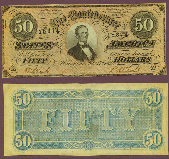 Item Number: CC-29 Extremely Fine+ T-66 Feb. 17 1864 CR-496 Serial # 18374 - YA Black & White signatures - Bust of Jefferson Davis president of the Confederate States. Brown serial #s with intricate Blue back.$175.00