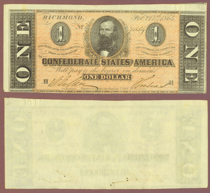 Item Number: CSA-112 About Uncirculated - Feb. 17th 1864 Portrait of Clement Clay a Alabama Senator for the Confederate States.Very close to uncirculated with very light handling. Serial number 71854 only 1 serial number from the other AU T-71 $1.00.$125.00