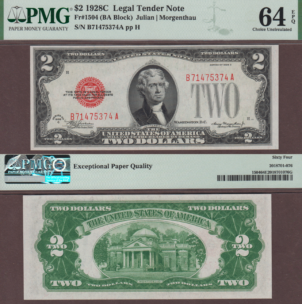 PMG Choice Uncirculated 64 EPQ - FR-1504 Julian/Morgenthau - Beautiful Fresh near GEM note with clean bright paper "EPQ" Exceptional Paper Quality. Consecutive serial number to the other PMG Choice Uncirculated 64 EPQ FR-1504 on web site.