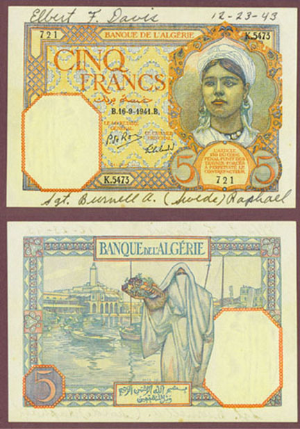 About Uncirculated - #77-B This note has been signed by Elbert F. Davis and Sergeant Burnell A. (Swede) Raphael on 12-23-43. Front is red-orange and blue on multi-colored underprint. Girl with kerchief on right side. Back is blue with a wharf scene behind a veiled woman holding fruit bowl at center right. Note has a draped head of woman on lower right as a watermark.