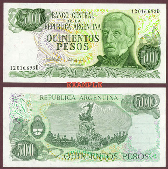 A-25 Choice Uncirculated - 500 Peso #303c Front is green on multi-colored underprint in beautiful pastel shades of green and lilac. Portrait of General Jose de San Martin at right and colored threads throughout paper. Back is green on multi-colored underprint and has picture of the Army monument Cerro de la Gloria Mendoza on the center.