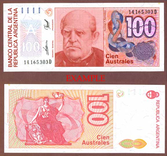 Item Number: ARG-23E Choice Uncirculated - 100 Pesos ND series D #327 Front is Dark red on multi-colored underprint with portrait of D. F. Sarmiento at center. Liberty w/torch seated at left center on back. Multiple starburst watermark.$2.00