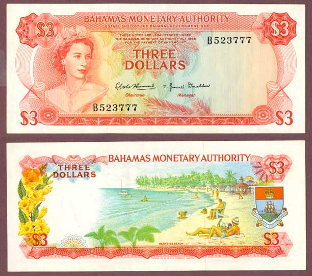 Item Number: B-28 About Uncirculated+ #28A Front is red on multicolored underprint with portrait of Queen Elizabeth II on the left. Back has colorful Paradise Beach with Coat of Arms on right and shellfish watermark on left.$40.00