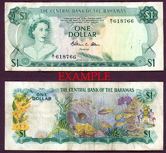 Item Number: B-33E Fine or Better - #35B Allen signature - Front is Dark blue green on multicolored underprint with portrait of Queen Elizabeth II on the left. Back has colorful sea garden with Coat of Arms on right and shellfish watermark on left.$8.00