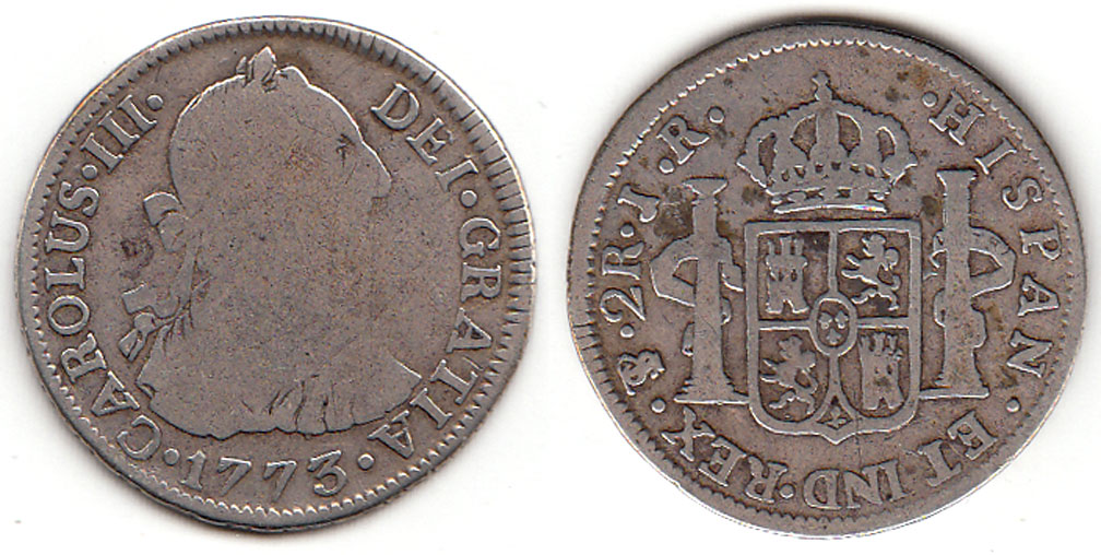 Very Good+ 1773 PTS/JR 2 Reales KM-53 .9030 Silver. Approximately 28MM. PTS monogram = Potosi Mint.