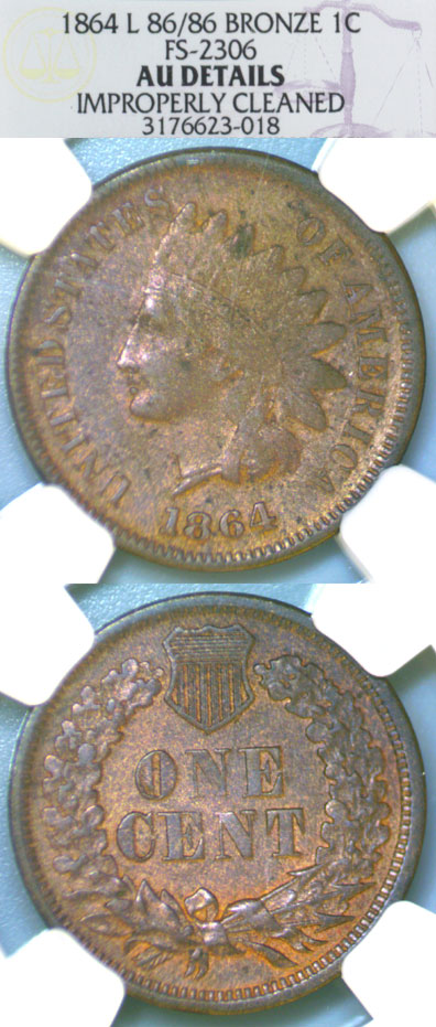 IC-223-CC NGC About Uncirculated Details - Improperly Cleaned - FS-2306 "L" on Ribbon, Repunched Date the 8 & 6 are repunched south on the inside loops. In addition to being a scarce date and variety the reverse die is rotated 180 degrees. If it was cleaned it was long ago and has retoned nicely. Scarce date with an unknown mintage.