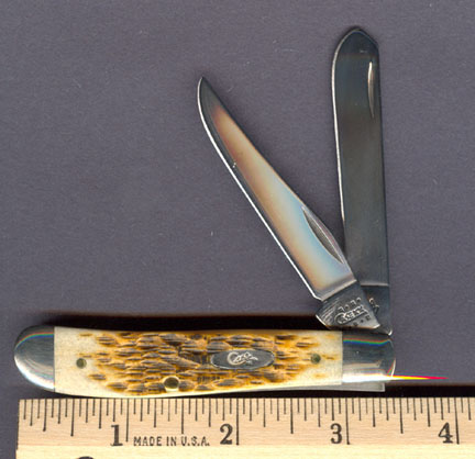 CA-26 This is the very popular 3 1/2" Mini Trapper style with clip and spey blades. This knife has the popular Amber Bone Handle. The interesting thing about this knife is it is a Factory Error the # on the blade is 4207SS not 6207SS as it should be. Not only is this a scarce knife it is new in the original green box with Case info insert and wrapped in the original brown paper. This knife is for the collector who wants the best mint condition knives or the best Factory Errors they can find. Case made in the USA by American Craftsmen!