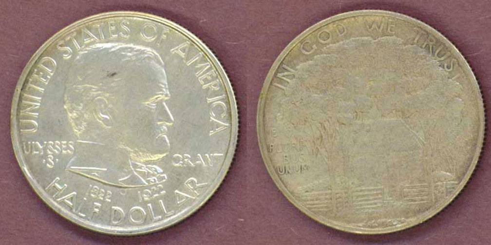 CHD-120 About Uncirculated - Grant Memorial Half Dollar - The obverse has been cleaned. The Grant commemorative half was struck as a 100 year souvenir of Ulysses S. Grants birth 1822-1922. The reverse shows the Grant house in Point Pleasant, Ohio where Grant was born. Low mintage of only 67,405