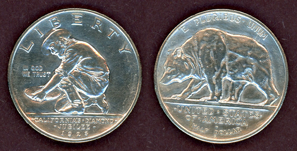 About Uncirculated - California Diamond Jubilee Half Dollar - Light hairlines.. Kneeling Forty-Niner on obverse with a walking grizzly bear on the reverse. 75th anniversary of admission of California into the union. Mintage of only 86,394