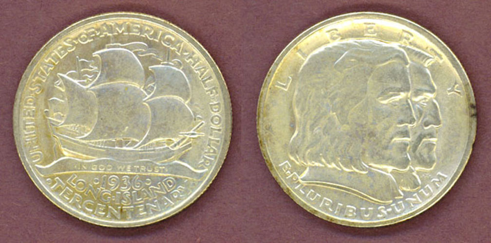 CHD-60 About Uncirculated+ Long Island Tercentenary Half Dollar - Excellent luster with the lightest touch of hairlines. Nice design with a Dutch ship on the reverse. The reason for this coin was the 300th anniversary of the first white settlement on Long Island. Mintage of only 81,826
