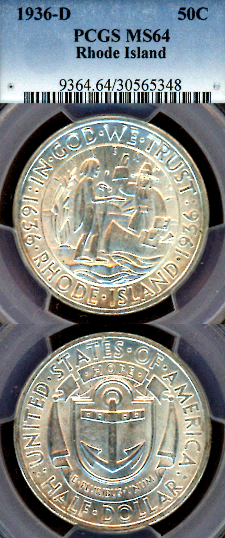 Item Number: CHD-221CC PCGS MS-64 - Rhode Island Tercentenary Half Dollar - Bright, white frosty and clean with great luster. The reason for this coin was the 300th anniversary of the founding of Providence Rhode Island. Small mintage of only 15,010$175.00