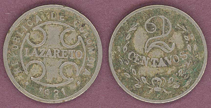 Fine+ - 2 Centavo KM#L10 Copper-Nickel - Special Leprosarium coinage - Made for the three leper colonies of Columbia. The colonies were closed in 1950. Made at the Bogota Mint.