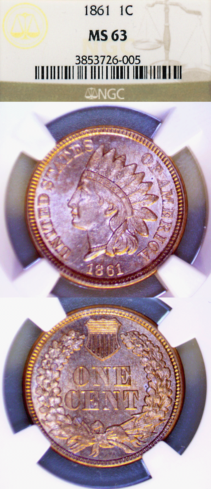 Item Number: IC-342CC NGC Mint State 63 - Well struck clean surfaces with blazing mint luster. Lowest minted of the Copper-Nickel (1859-1864) Indian cents. Mintage 10,100,000$495.00