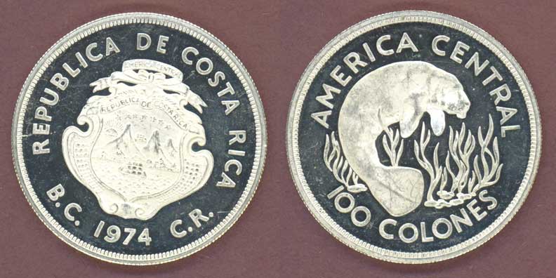 About Uncirculated- 100 Colones .925 Fine Silver #201A Large 42 MM coin With Manatee on reverse. Low mintage of only 11,000