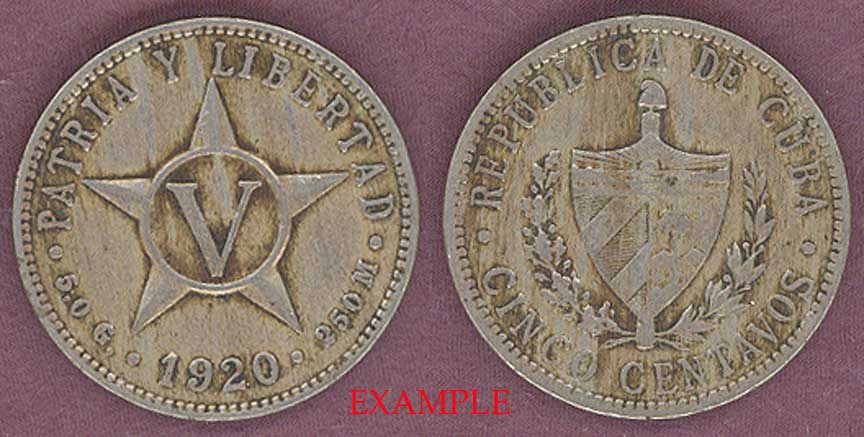 Item Number: CUBA-35 Fine or Better - Copper-Nickel #9.1 Five Centavo You will receive a Fine or Better Five Centavo of this Type.$3.00
