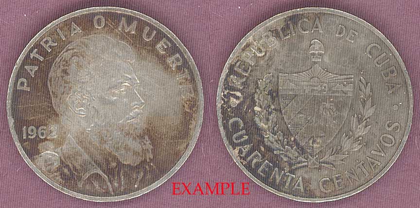 Item Number: CUBA-42E Very Good or Better - Copper-Nickel #32 Forty Centavo - Camilo Cienfuegos Gomaran on Obverse National Arms within wreath on Reverse. You will receive a Very Good or Better Forty Centavo of this date.$10.00