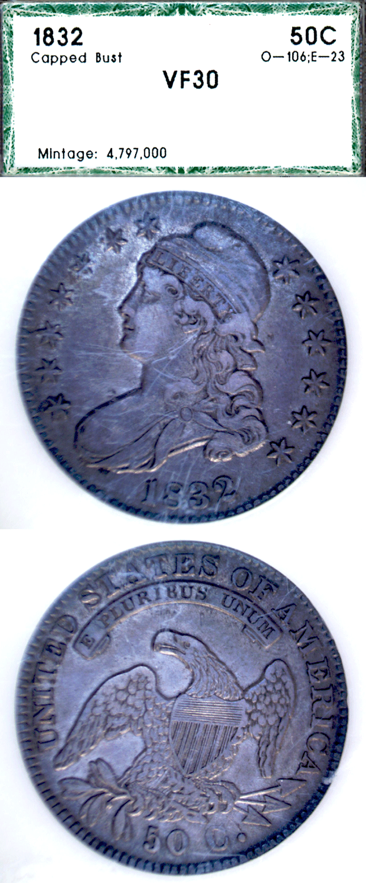 1832 50c PCI VF 30 US capped bust silver half dollar