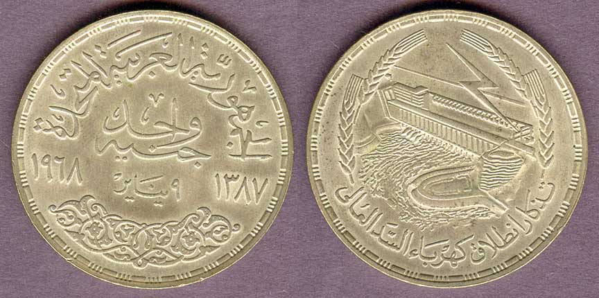 Item Number: Egypt-28 About Uncirculated - One Pound KM-415 .720 Silver. Power station for Aswan Dam. Large silver dollar size.$45.00