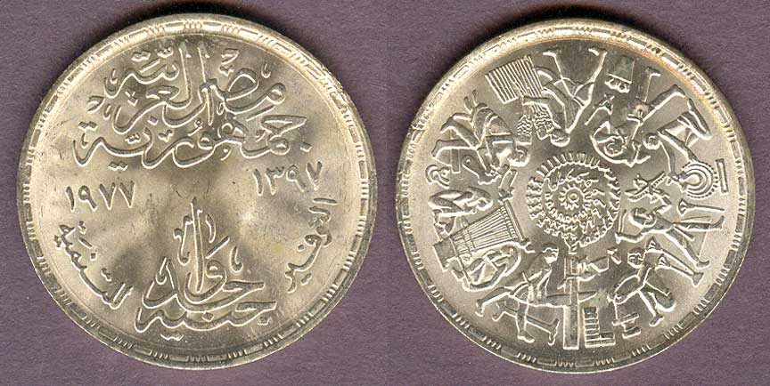 Item Number: Egypt-27 Uncirculated - One Pound KM-472 .720 Silver. Egyptian Laborers surround central design. Large silver dollar size.$45.00