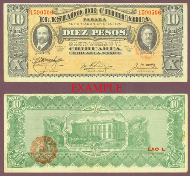 Item Number: MXR-43E Extremely Fine - #S535C Large Note. Series -N- Front Has portrait of F. I. Madero at left and Gov. A. Gonzalez at right with red serial numbers. Back is green with red scalloped seal.$25.00