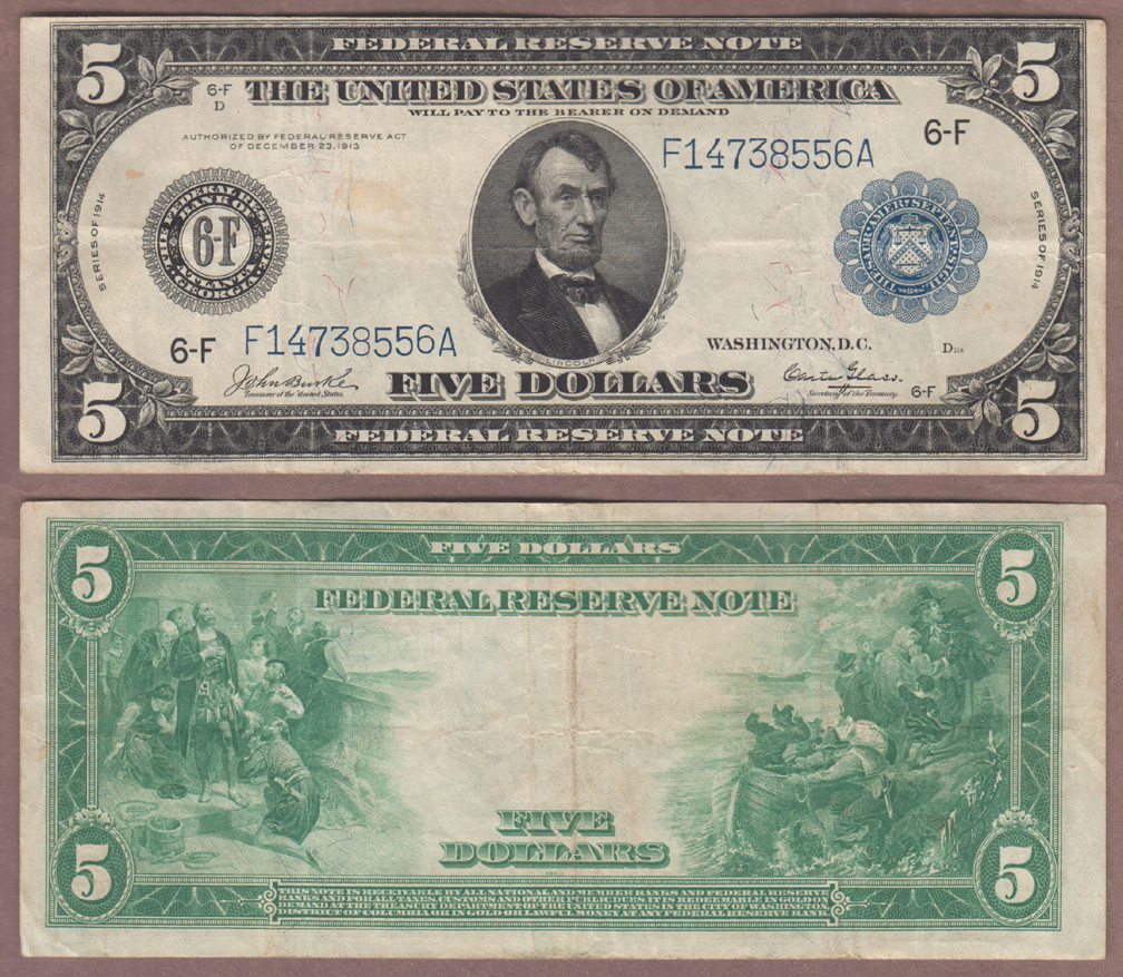 Item Number: LFRN-113 Very Fine - FR-865 Large Size Note from the Cleveland District 6-F Burke/Glass signatures. The back illustrations are Columbus in sight of land and the landing of the Pilgrims. $195.00