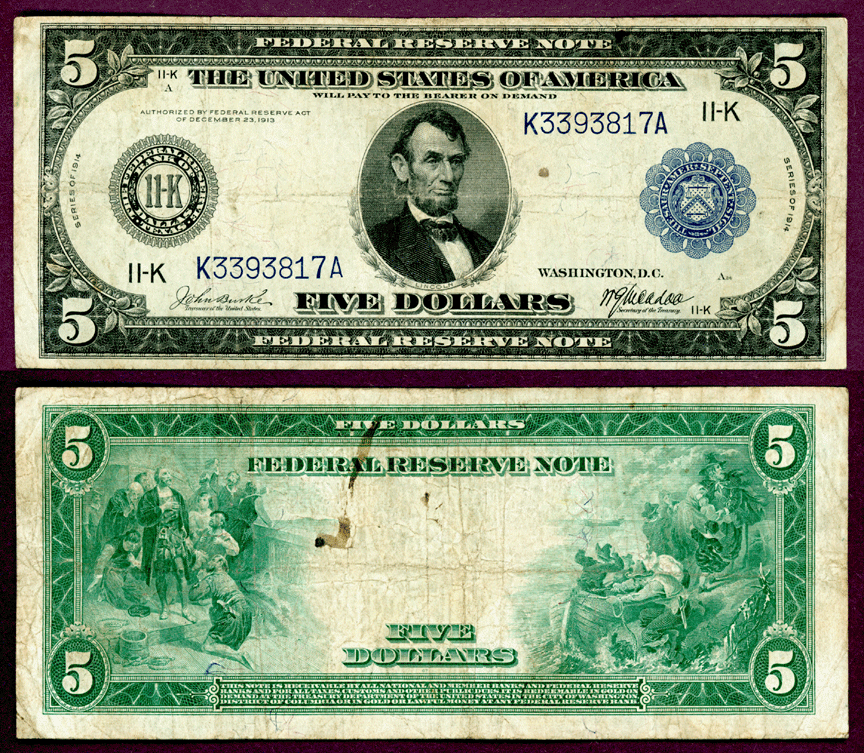 Fine - FR-884 - Large Size Federal Reserve Note from the Dallas District 11-K. With harder to find Burke/McAdoo signatures. As of 5/25 only 71 notes known in Track & Price census. The back illustrations are Columbus in sight of land and the landing of the Pilgrims.