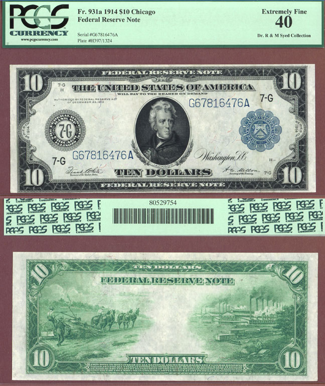 Item Number: LFRN-60 PMG Extremely Fine 40 - FR-931a Large Size Federal Reserve Note from the Chicago District 7-G and the "a" variety. White/Mellon signatures. Original bright note from the Dr. R&M Syed Collection. Popular Agriculture and Industry theme on the back.$325.00