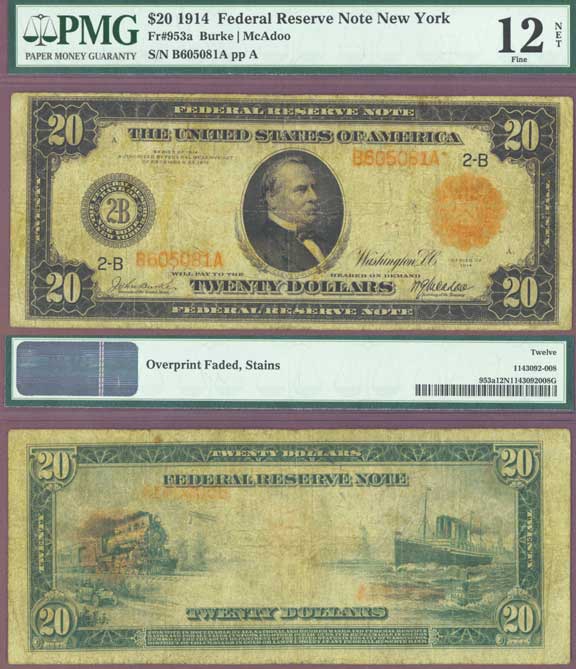 Item Number: LFRN-39 PMG Fine 12 Net - Overprint faded, Stains. FR-953A Burke/McAdoo - From the New York District 2 - As of 5-25 only 116 $20.00 FR-953A large size know in the T&P census in all grades.$350.00