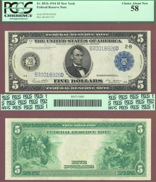 1914 $5.00 FR-851b New York US Large size federal reserve note PMG Choice AU 58