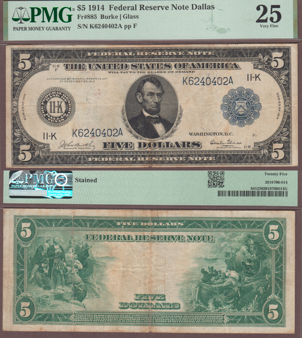 PMG Very Fine 25 Stains - FR-885 Burke/Glass - Large Size Federal Reserve Note from the Dallas District 11-K. Light stains mainly on back. As of 5/25 only 80 notes known in Track & Price census. The back illustrations are Columbus in sight of land and the landing of the Pilgrims.