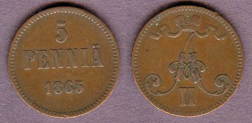 Item Number: Fin-26 Very Fine - 5 Pennia KM-4.1 .Copper. Original uncleaned coin with a low mintage of 480,000$35.00