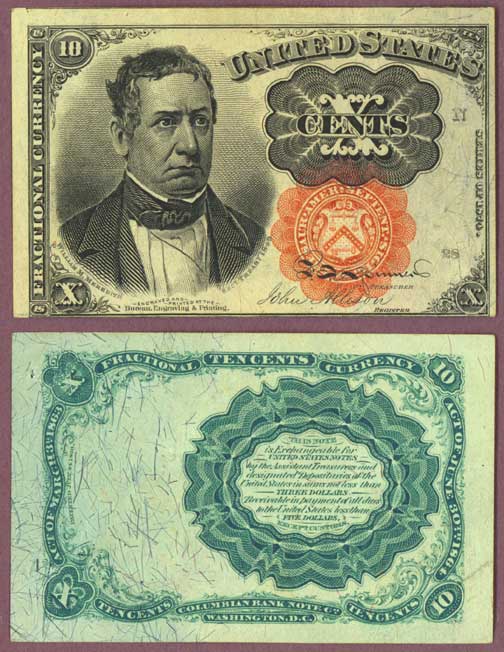 Almost Uncirculated - FR-1266 - Fifth issue 2-26-1874 to 2-15-1876 - William M. Meredith, Secretary of the treasury 1849-1850. This is the short key variety with red seal. Has one pin hole in upper right.