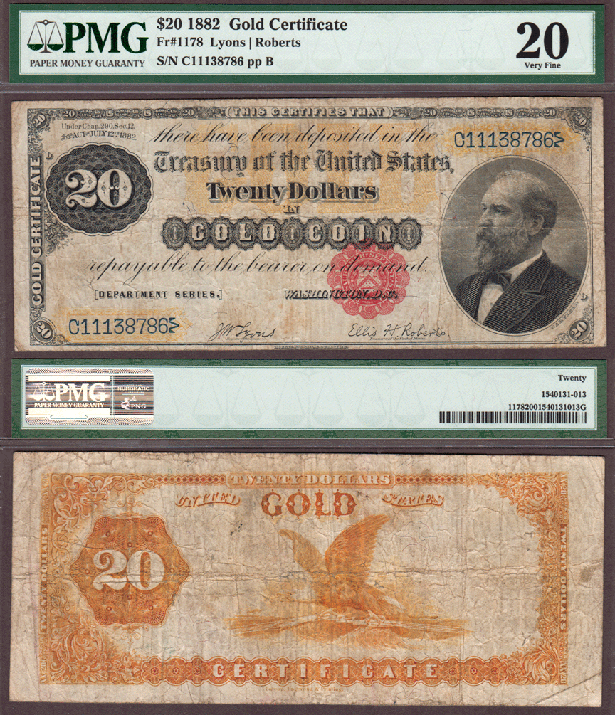 Item Number: LGN-101 PMG Very Fine 20 - FR-1178 Lyons-Roberts Attractive US Large Size Gold Certificate that is well margined on both sides with nice color contrast. $1,295.00