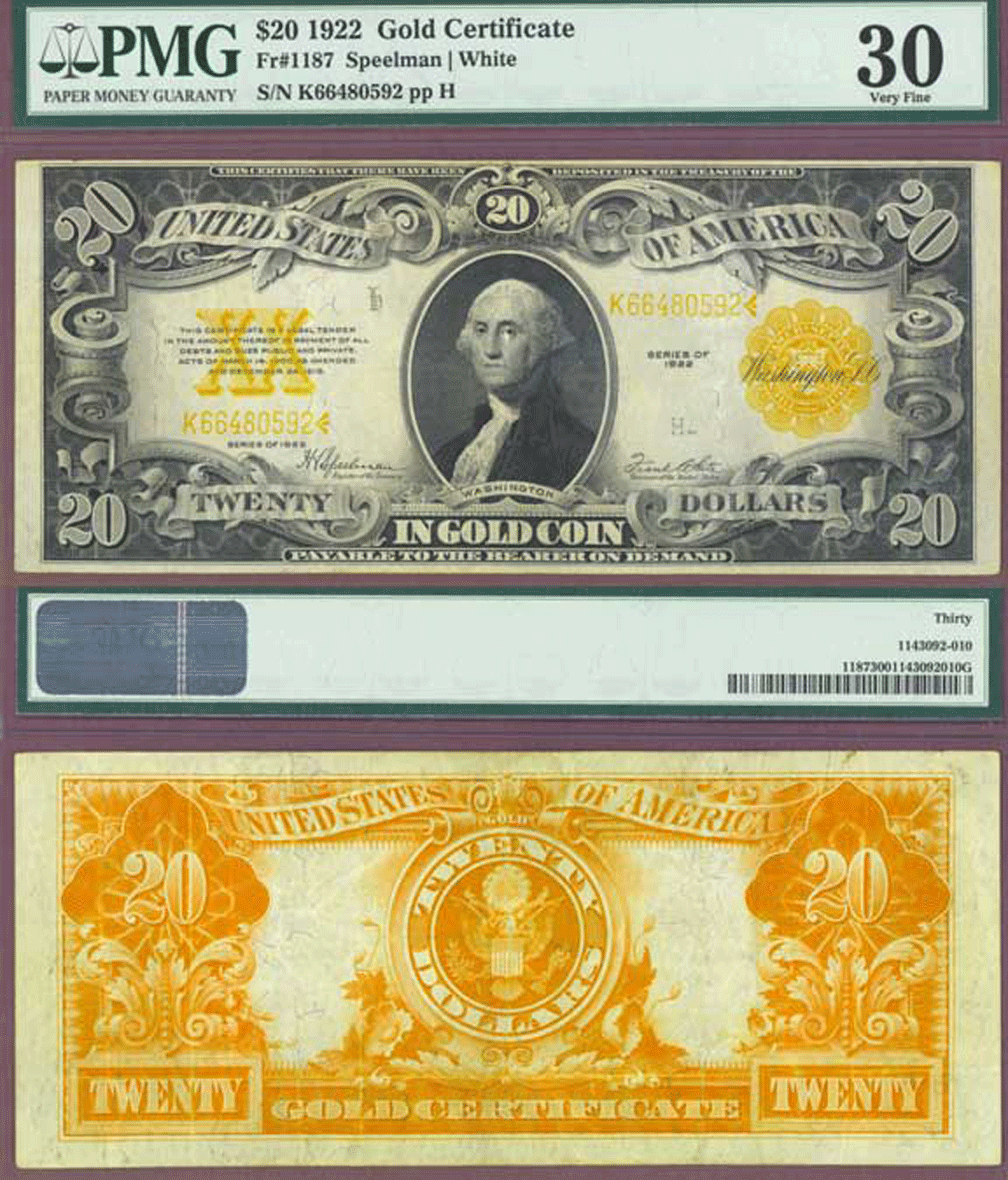 Item Number: LGN-25. PMG Very Fine-30 - FR-1187 Speelman/White - Well centered attractive US Large Size Gold Certificate with nice contrast and no tears, pin holes or ink marks. Above average Very Fine with no problems.$650.00