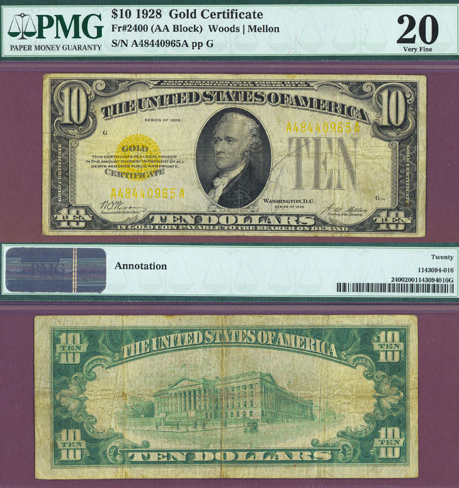 1928 - $10 FR-2400 PMG Very Fine 20 US Gold Certificate