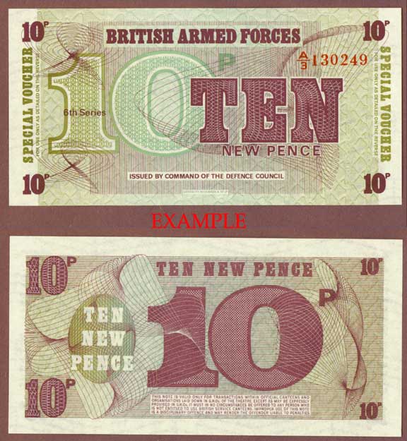 Item Number: GBMil-23E Uncirculated - 10 Pence - ND British Armed Forces Special Voucher #M-45A Violet,green and olive.$4.00
