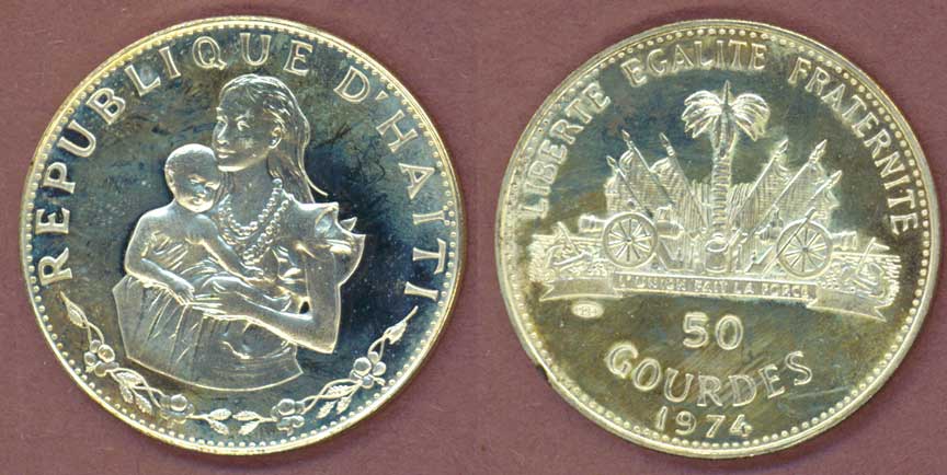 Proof - 50 Gourdes #105 .925 Silver 1974 Woman and Child. Nice design large sterling silver dollar size Proof!
