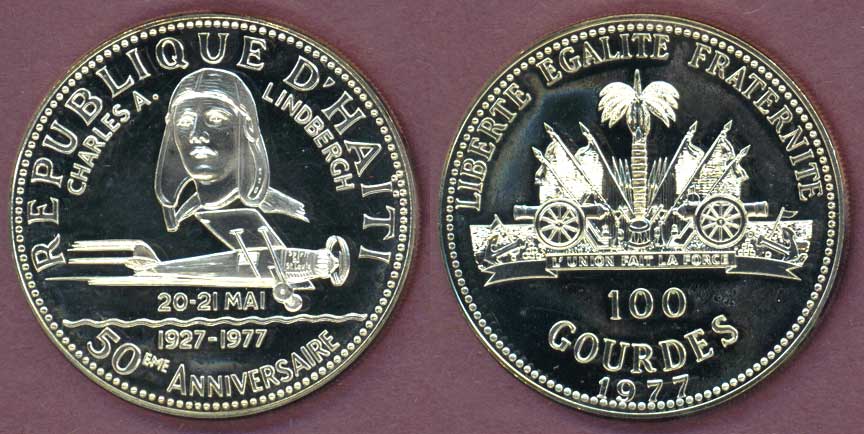 Uncirculated Deep Mirror Prooflike - 100 Gourdes #134 .925 Silver - 50th Anniversary of Lindbergh's New York to Paris Flight. Portrait of Lindbergh in fliers cap above the "Spirit of Saint Louis" on obverse and Haiti's National arms on reverse. Large sterling silver coin 45 MM and weighs 43 grams! A few very light hairlines on obverse. Comes with mint issued leather like case with paper insert. Extremely LOW Mintage of only 321