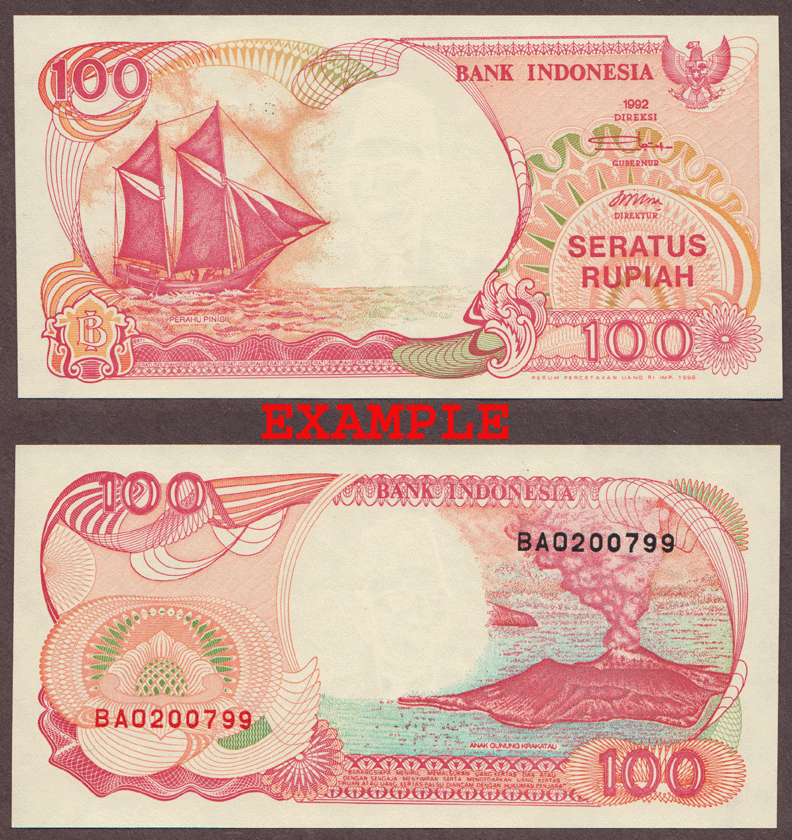 Item Number: INDO-50E Uncirculated - #127 Pale red on orange and multicolored underprint with sailboat Pinisi at left. Back: Volcano Anak Krakatua at right. Watermark: Ki Hajar Dewantara.$2.00