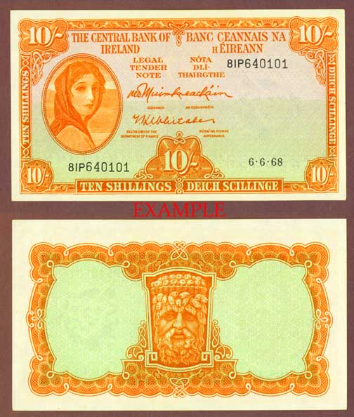 Item Number: Ireland-24E Choice/Gem Uncirculated - #63-A 6-6-68 Front is orange on light green. Portrait of Lady Hazel Lavery on left side. Back has mask at center.$65.00