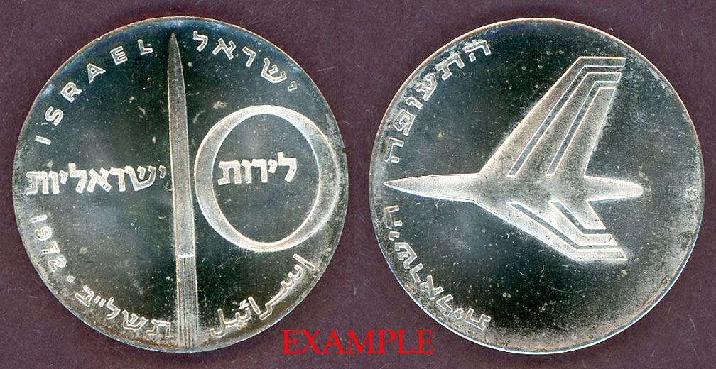 Item Number: IS-28E Uncirculated -10 Lirot #62 - 37 MM .900 Silver - 25th Anniversary of independence. Stylized jet on reverse. Lettered edge$95.00