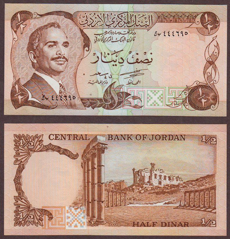 Item Number: Jordan-50 Uncirculated - #17 - Brown on multicolored underprint with King Hussein at left. Back: Jerash at right. Watermark: King Hussein wearing kuffiyeh.$10.00