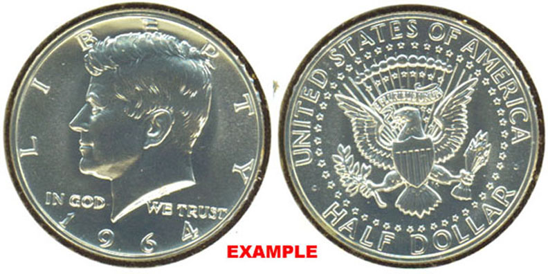 Proof-65 or Better- Flashy Proof of the first year of the Kennedy Half and the last year of 90% silver coinage. Mintage of 3,218,019
