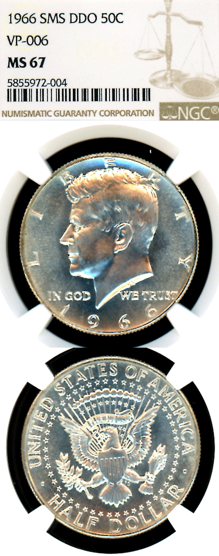 Item Number: KHD-127 NGC Mint State 67 - "SMS" Special Mint Set Double Die Obverse. Doubling on profile, IN GOD WE TRUST, and designers initials. Flashy GEM+ Double Die.$245.00